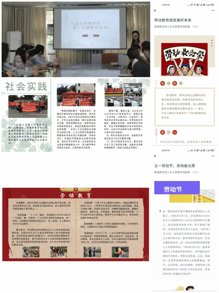 开展一次集中宣传活动。4月28日,必威betway西汉姆联团委展开“三爱”学习主题教育活动,由学院团委副书记张露讲授,2020级全体团干参加。张露以闻一多的主要事迹为开篇,其爱读书、爱国情感影响了在场的每一位学生。青春正当时,逐梦新征程,张露鼓励同学们积极学习优秀文化思想,全面提高自身素质,脚踏实地、勇担重任,努力成为新时代的先行者。4月28日,必威betway西汉姆联学生会宣传部制作并张贴了“劳动教育”和“实践活动”两块展板,图文并茂地展现了必威betway西汉姆联近期劳动教育的成果。4月29日至5月1日,必威betway西汉姆联学生会微信公众号发布两篇推文《劳动教育成就美好未来》、《五一劳动节,劳动最光荣》,全面做好劳动教育宣传工作,营造良好舆论氛围。