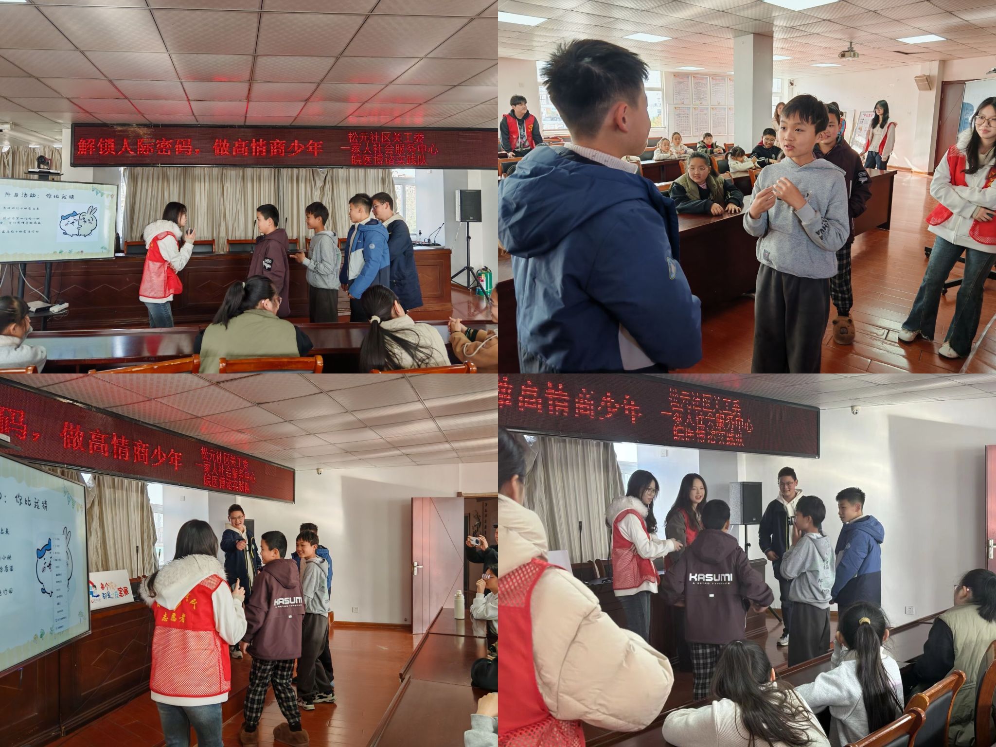 活动旨在为儿童构建健康的人际交往认知体系,借助“你比我猜”互动游戏进行破冰,通过“你比我猜”这一过程使儿童在欢笑中直观认识到清晰、准确表达的重要性,为后续的知识讲解做好铺垫。宣讲环节,志愿者们结合儿童的认知特点,通过动画案例等方式展开核心内容讲解,从“什么是人际交往”“为什么需要人际交往”“人际交往的原则有哪些”和“遇到冲突怎么办”四个方面讲解人际交往的意义,引导儿童理性思考解决问题,避免采用哭闹或争吵的方式处理问题。宣讲最后的“小手掌寄语”环节,进一步深化了儿童对宣讲内容的理解与记忆。
