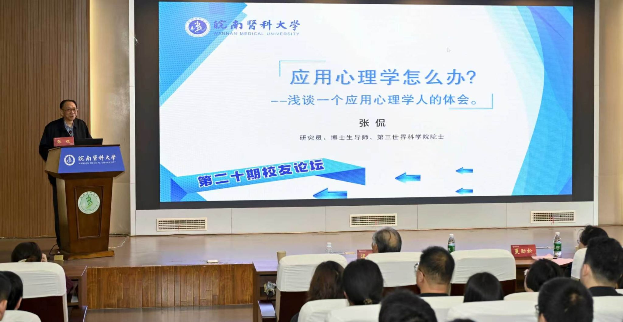 阳春三月,春意盎然,万物勃发。正值学校正式更名皖南医科大学、开启高质量发展新征程的重要时刻,3月28日下午,我校第二十期 “校友论坛”在滨江校区南区学术报告厅举行。学校1976 届杰出校友、第三世界科学院院士、中国科学院心理研究所原所长、研究员、博士生导师张侃载誉返校,以“应用心理学怎么办——浅谈一个应用心理学人的体会”为题,为应用心理学专业师生带来一场兼具学术深度、育人温度与使命高度的专题报告。校党委书记夏劲松,校友办、必威betway西汉姆联相关负责人参加活动。
